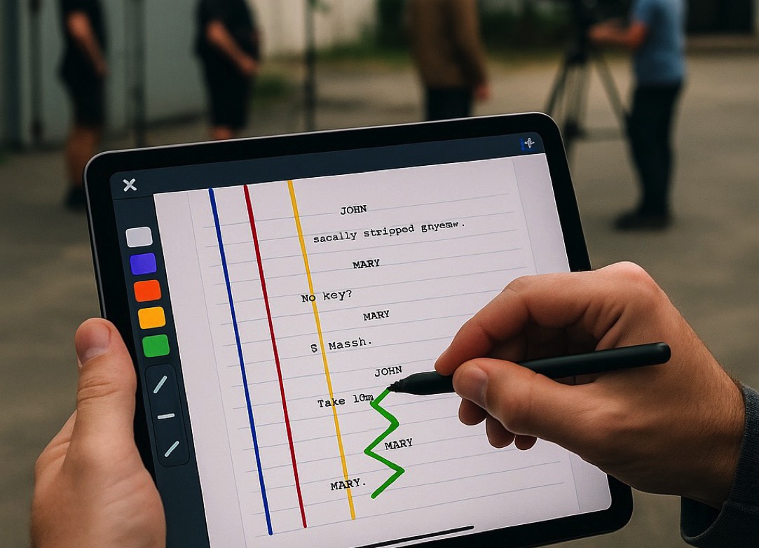 The film crew needed a tool that would allow them to work with the current version of the script directly on set, while also enabling visual notation of camera shots and technical notes during filming. Traditional paper scripts (“Line Script”) had to be constantly updated to reflect script changes, directorial instructions, or actor improvisation. This process was slow, difficult to manage, and did not allow easy sharing of updates among team members. The goal was to create a digital interface that would support interactive script work, editing, and visual annotations, while respecting standard film notation conventions.